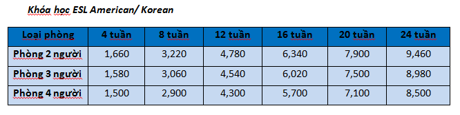 Ảnh học phí ESL American và Korean 📌 Có thể bạn quan tâmChứng chỉ tiếng Anh CambridgeKhóa học Business English (EBC) tại Trường Anh ngữ FellaKhóa học Tiếng Anh gia đình (Family Course) tại Trường ELSAHình ảnh – Trường Anh ngữ C2 UBEC, Cebu, Philippines Đăng ký tư vấn miễn phíCam kết bảo mật thông tin 100%, Tư vấn hoàn toàn miễn phí