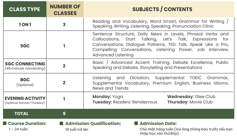 - Lớp học tự chọn thứ Bảy (ngoại trừ thứ 7 ngay sau ngày English Day): Lớp học từ 10:00 AM – 12:00 NN. Những học viên có thời gian học hạn chế, lớp học thứ 7 sẽ giúp người học tiến bộ tối đa thông qua việc có thêm cơ hội để luyện tập và sử dụng tiếng Anh với các giáo viên giàu kinh nghiệm