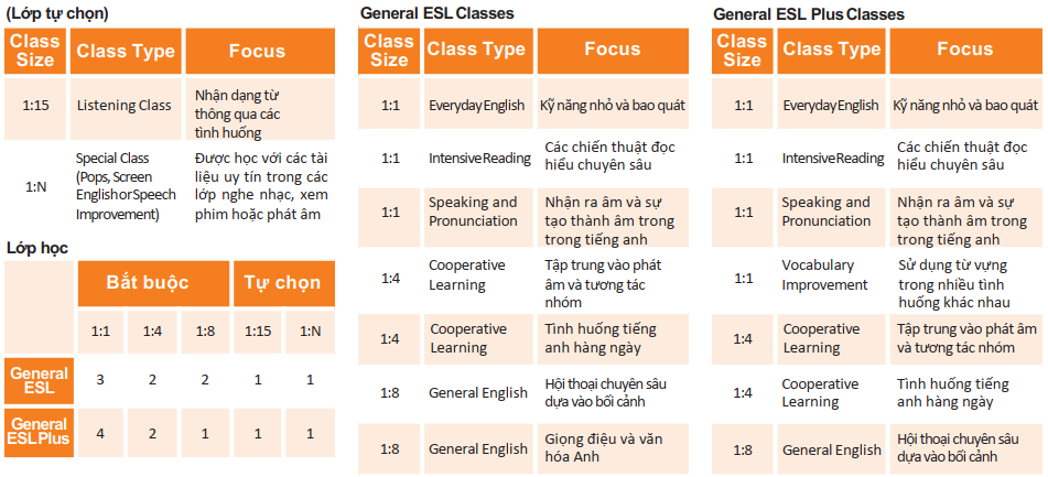 • Tiếng Anh tổng quát (lớp 1:2 – giáo viên người Philippines): những lớp này được thiết kế đặc biệt dành riêng cho học viên có trình độ 1 & 2. Phương pháp này tập trung tiếp cận vào sự phát triển cả 4 kỹ năng qua việc trình độ và nền tảng ngang nhau. Học viên có được những trải nghiệm hữu ích trong các đoạn hội thoại và thực hiện chỉnh sửa với bạn cùng lớp